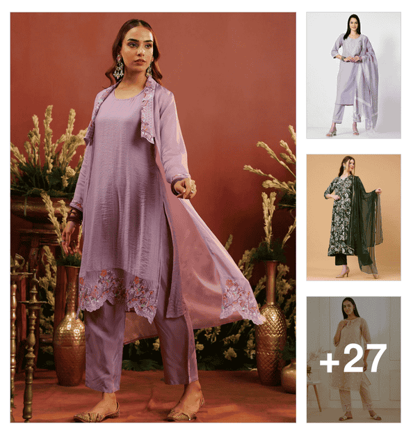 women blue v-neck bell sleeves embroidered & mirror work detail gotta lace straight kurta with pant festive set