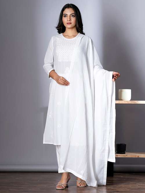 - Find gorgeous sets of ethnic wears in trending designs in white colors suitable for festive wear of occasions.