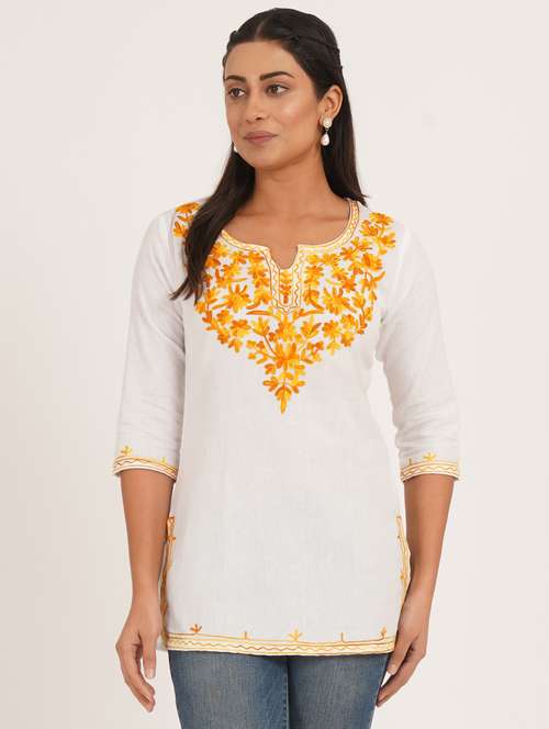 - » women solid with work notch neck straight kurti