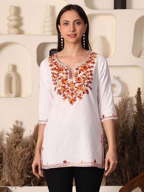 women solid with work three quarter sleeve straight kurti