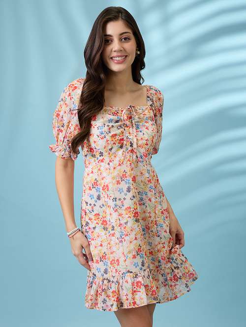 women white all over floral printed  square neck puff sleeves ruched detail georgette ruffle hem mini party dress - 21926746 -  Standard Image - 1 women white all over floral printed  square neck puff sleeves ruched detail georgette ruffle hem mini party dress - 21926746 -  Zoom Image - 1