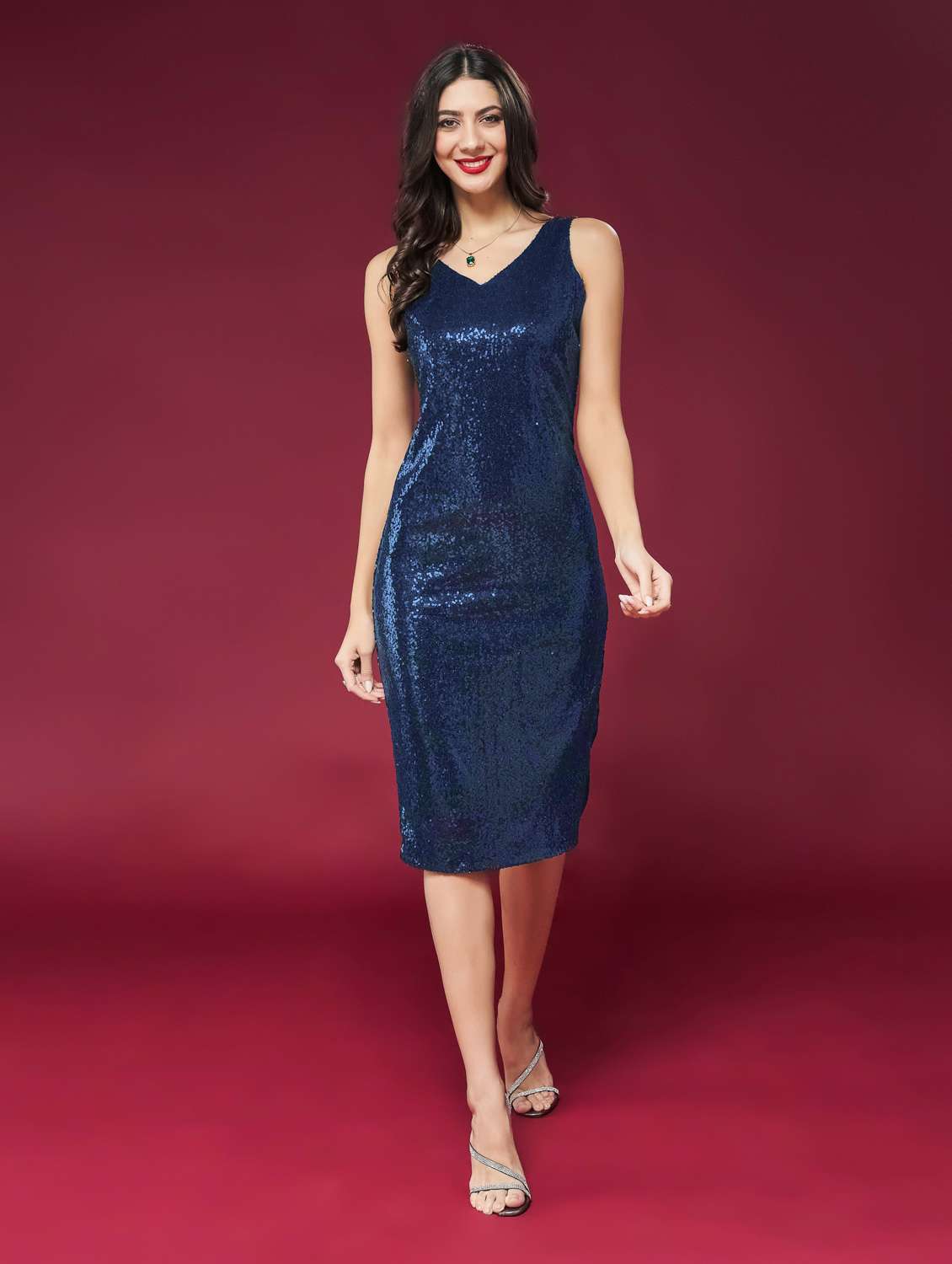 - Dress up in a soothing pattern and don this dress made of stretch sequin fabric material.