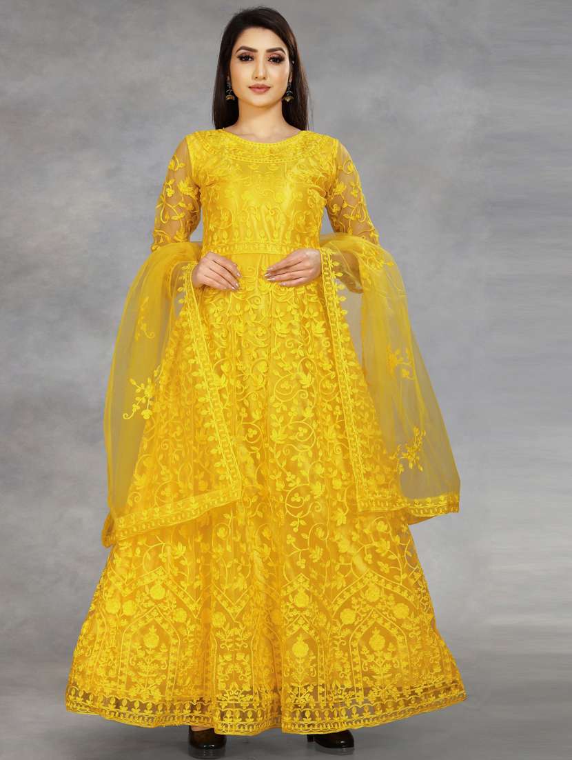 yellow embroidered fit & flare gown